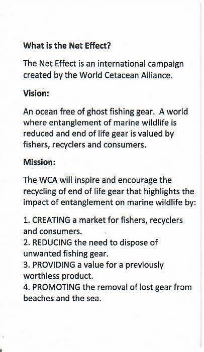 The day-to-day tasks of the Gloucester internship were very different from Brighton. Like Cabo Trek, Cape Ann Whale Watch is also a WCA certified responsible whale watching operator. One central purpose of the interns’ work was to inform customers on boat tours that they were in “the whales’ home” now, a home wherein the whales were under no obligation to put on a show for them. Rose Anne continued her creation of teaching tools and marketing materials with the other interns, the focus of which stemmed from a project she helped with in Brighton — a cartoon they created together called “Netty the Net”, the story of a little net who doesn’t realise how much damage he’s done to an orca. In Gloucester, this project developed into the “Net Effect” campaign, for which Rose Anne regularly wrote informative blog posts. In one 2016 blog post titled “The Reach of Ripples”, she writes, “... I discovered how truly amazing and humbling it has been to witness that moment when a fellow human being realises life on land is inextricably connected to life in our oceans.” The first boat of the day left at 7:45 a.m. every morning, and it was Rose Anne’s job to gather data and document anomalies or other interesting happenings during each whale watch. Daily conversations with tourists typically had to do with environmental damage, climate change, why we should care about marine wildlife, and what we can do stop the spread of ghost fishing gear in our oceans. “We are the only sentient lifeforms on the planet polluting everything,” as Rose Anne put it.